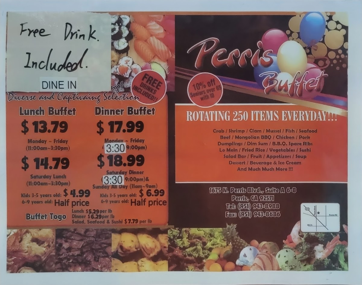 This mix of dishes fits well with Perris Buffet’s inviting atmosphere — an easygoing spot where you can enjoy a variety of tastes at your own pace. Whether you’re craving simple comfort food or a bit of adventurous dining with sushi and seafood, the menu supports a flexible, friendly dining experience throughout the day.